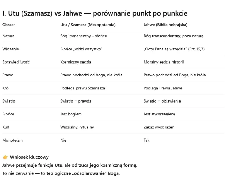 Jahwe natomiast stanowi radykalne zerwanie z obiema koncepcjami, mimo że zachowuje ich język i symbole. Biblia przejmuje od tradycji mezopotamskiej ideę Boga jako sędziego, który widzi wszystko, stoi ponad władzą i jest źródłem prawa, ale całkowicie odrzuca utożsamienie Boga z jakimkolwiek elementem natury. Jahwe nie jest słońcem, nie rodzi się codziennie i nie podlega cyklom kosmicznym. Światło, tak ważne u Utu i Ra, zostaje w Biblii przekształcone w metaforę objawienia, prawdy i moralnego prowadzenia. Słońce zostaje zdegradowane do roli stworzenia, a jego kult uznany za bałwochwalstwo. W przeciwieństwie do Ra, Jahwe nie legitymizuje władzy królewskiej przez boskie pochodzenie, lecz podporządkowuje króla prawu. W przeciwieństwie do Utu, nie jest związany z widzialnym zjawiskiem, lecz działa w historii, reaguje na ludzkie czyny i wchodzi w relację przymierza.